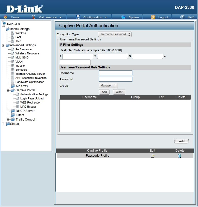 В меню Advanced Settings → Captive Portal → Authentication Settings выбирам Encryption Type Username/Password: