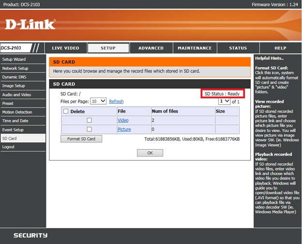 Шаг 6: О том, что карта отформатирована успешно и готова к работе, свидетельствует надпись SD Status : Ready.