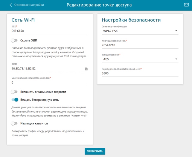 - в поле “ключ шифрования PSK” задать нужное значение пароля (не менее 8 символов) и нажать “Применить”