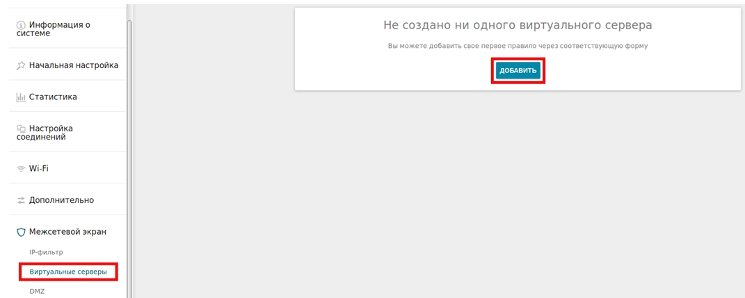 - В разделе Межсетевой экран выберите подраздел Виртуальные серверы и на открывшейся странице нажмите кнопку Добавить.