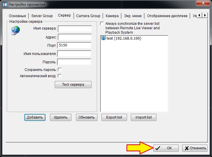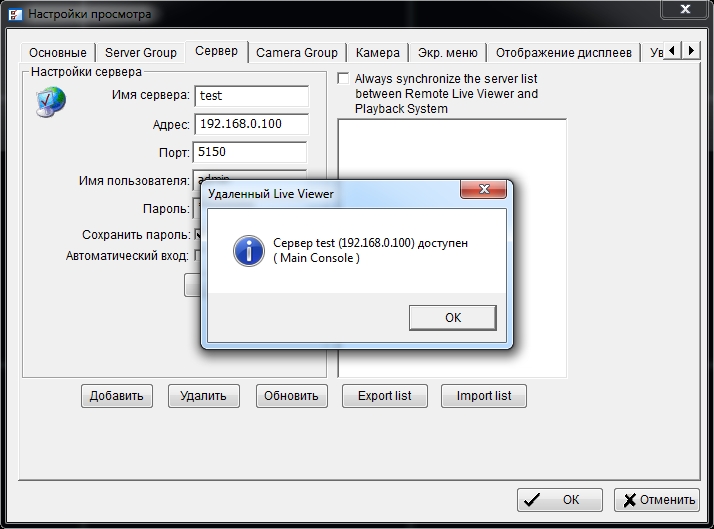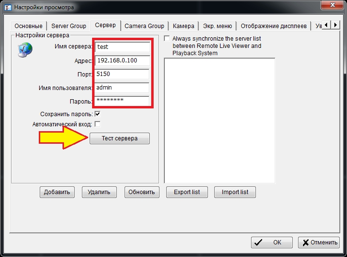 Для проверки доступности сервера нажмите кнопку Тест сервера.