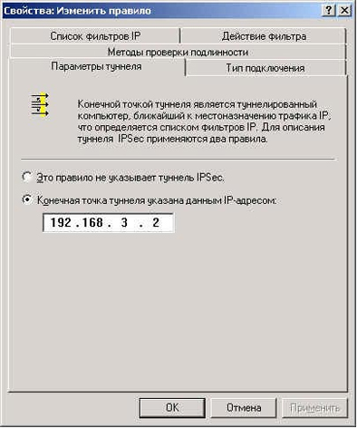 Конечная точка туннеля указана данным IP адресом - 192.168.3.2 - таким образом указываем адрес удаленного шлюза.