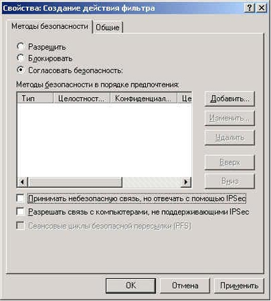 Переходим на закладку действие фильтра. Нажимаем Добавить. На закладке общие вводим имя действия фильтра DFL-100 - win2000. Переходим на закладку Методы безопасности .Убираем галочку Принимать небезопасную связь, но отвечать с помощью IP и выбираем Согласовывать безопасность.