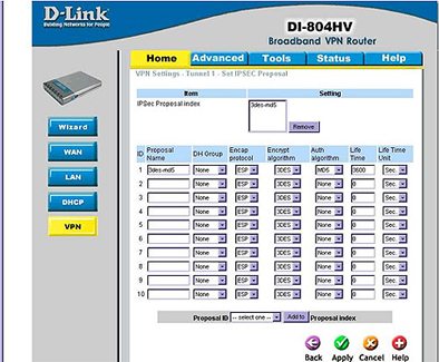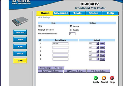 2) Зайдите на вкладку Home -> VPN. В настройках VPN, включите VPN. Задайте максимальное количество туннелей, например 5. В поле ID 1, введите имя туннеля, 'dfl-700'. Нажмите 'Apply', затем 'Continue'. В поле ID 1, установите метод 'IKE' и, затем, нажмите 'More'.