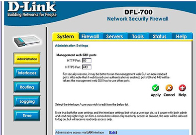 1) Присоединитесь к DFL-700 посредством WEB-интерфейса с использованием его IP-адреса (https://192.168.1.1 в этом примере) и введите имя пользователя и пароль.