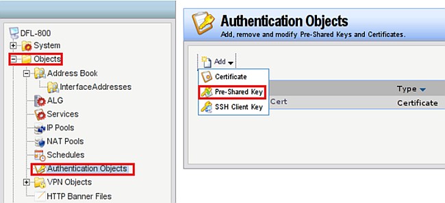 Выберите Objects → Authentication Objects, нажмите кнопку Add и выберите Pre-Shared key.