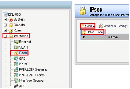 Выберите Interfaces → IPSec, нажмите кнопку Add и выберите IPSec Tunnel.