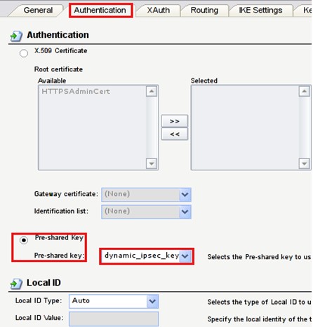 Выберите аутентификацию Pre-shared key и укажите из выпадающего списка dynamic_ipsec_key.