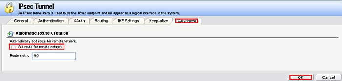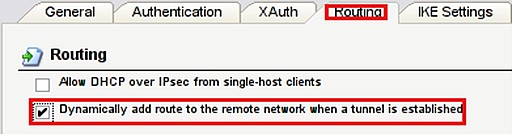 Перейдите на вкладку Routing и установите галочку напротив Dynamically add route to the remote network when a tunnel is established.