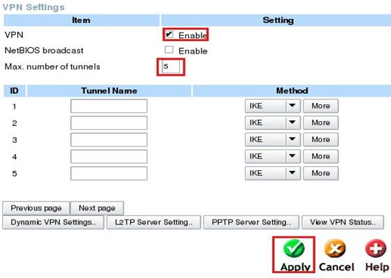 Поставьте галочку напротив VPN, затем в поле Max. number of tunnels укажите значение равное ожидаемому количеству тоннелей плюс один (в примере 5). Нажмите кнопку Apply.