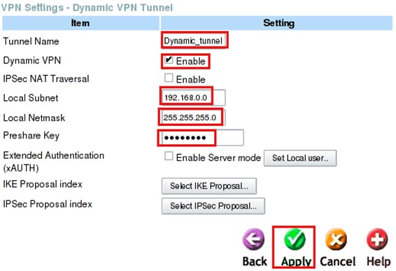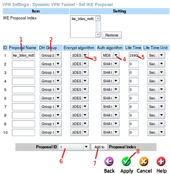 После применения настроек нажмите кнопку Back, затем кнопку IPSec Proposal.