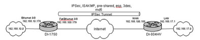 Этот пример демонстрирует настройку IPSec тоннелей между маршрутизаторами DI-1750/DI-2630/DI-3660 и DI-804HV.