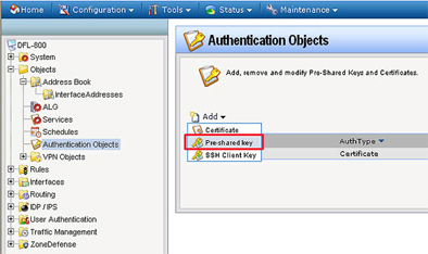 Шаг 2: С левой стороны, кликните по Objects, выберите Authentication Objects и кликните по Pre-shared key.