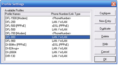 Шаг 2: Выберите DFL-800 в настройках профиля (profile settings) и кликните по Configure. Если профиль не существует, кликните по New Entry для создания нового профиля.