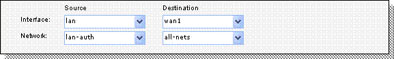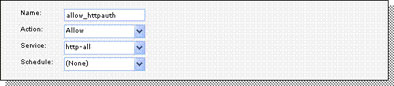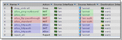 Сначала идут два правила, выделенные зеленым цветом. Эти два правила позволят прохождение пингов и DNS для всех пользователей. Затем идут два правила, отмеченных красным цветом, которые позволят только аутентифицированным пользователям воспользоваться FTP-сервисом (с помощью FTP ALG) и всем другим UDP и на основе TCP службам. Наконец далее идут три правила, отмеченных голубым цветом. Первое из них позволит пользователям выйти напрямую к аутентификации межсетевого экрана. Два других будут перенаправлять неаутентифицированных HTTP пользователей на межсетевой экран  для аутентификации.