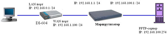 Вопрос: Установка соединения между интернет-шлюзами серии DI-XXX и PPTP-сервером провайдера, находящимся в другой подсети.