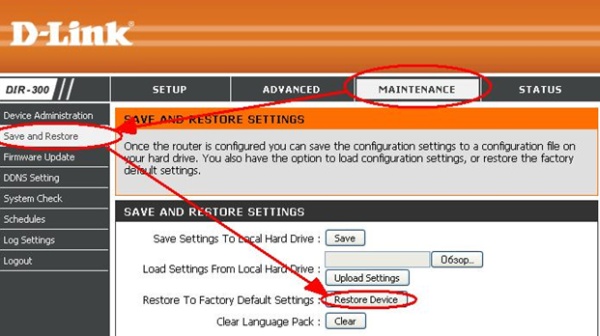Для программного сброса настроек к заводским необходимо на web-интерфейсе роутера (по адресу 192.168.0.1) зайти в меню Maintenance (Tools) > Save and Restore (SYSTEM) и нажать кнопку “Restore device” (Restore To Factory Default Setting).