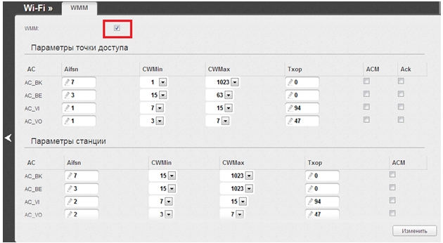 Установите флажок WMM и нажмите кнопку «Изменить».