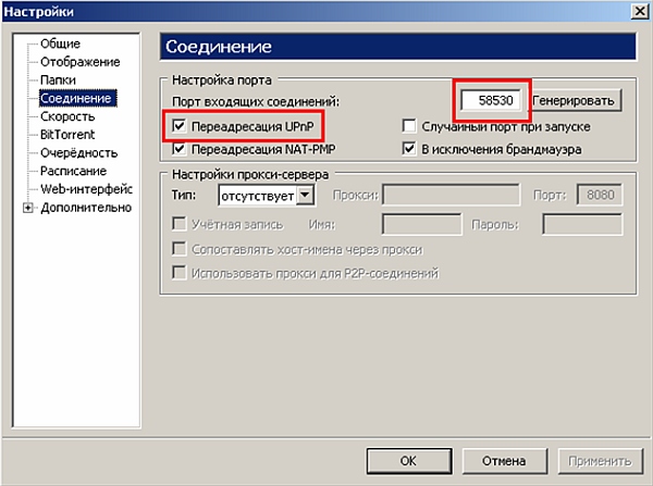 3. Перейдите в меню настроек клиента uTorrent: Настройки > Соединение. Поставьте галочку перед пунктом «Переадресация UPnP» и введите необходимый номер порта .