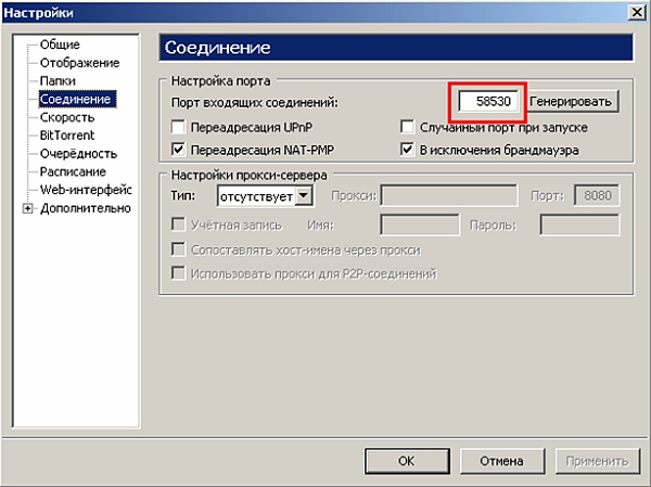 3. Перейдите в меню настроек клиента uTorrent: Настройки > Соединение. Введите необходимый номер порта.