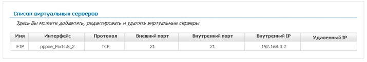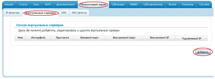 Перейдите в меню «Межсетевой экран» - «Виртуальные серверы» и нажмите кнопку «Добавить».