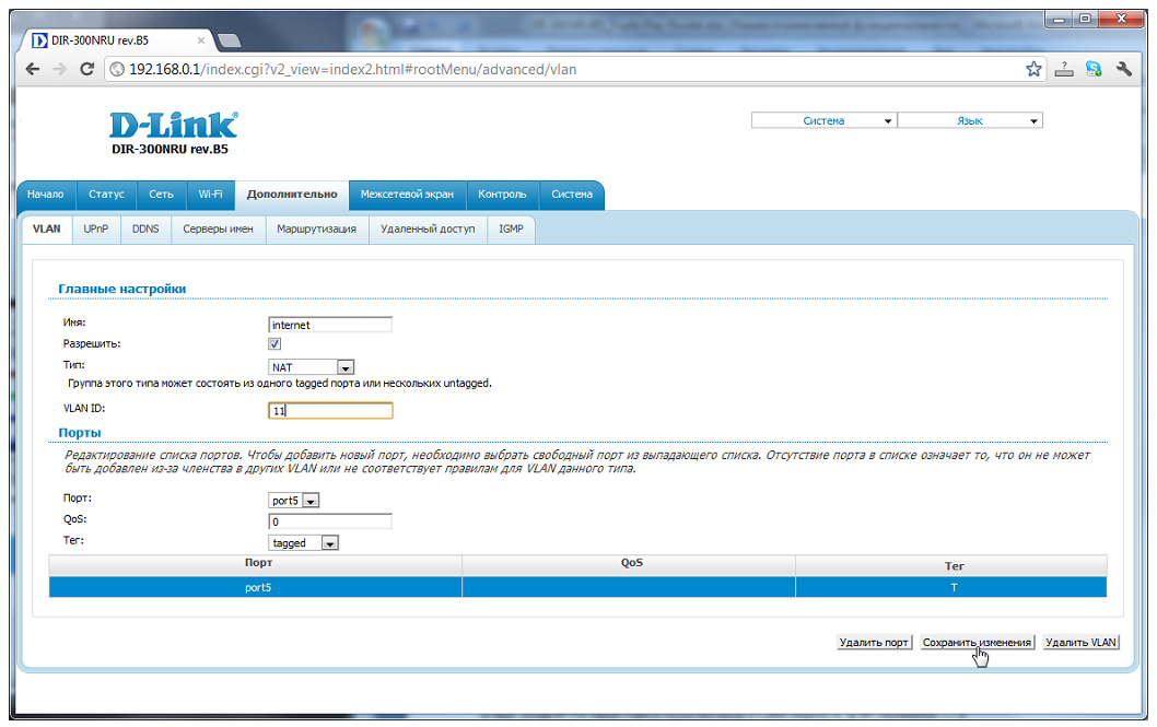 В списке «Порт» выбираем значение port5 (соответствует порту INTERNET маршрутизатора).
