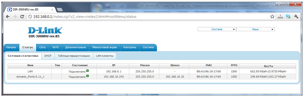В меню «Сеть» - подменю «WAN» и в меню «Статус» - подменю «Сетевая статистика» наблюдаем следующую картину: