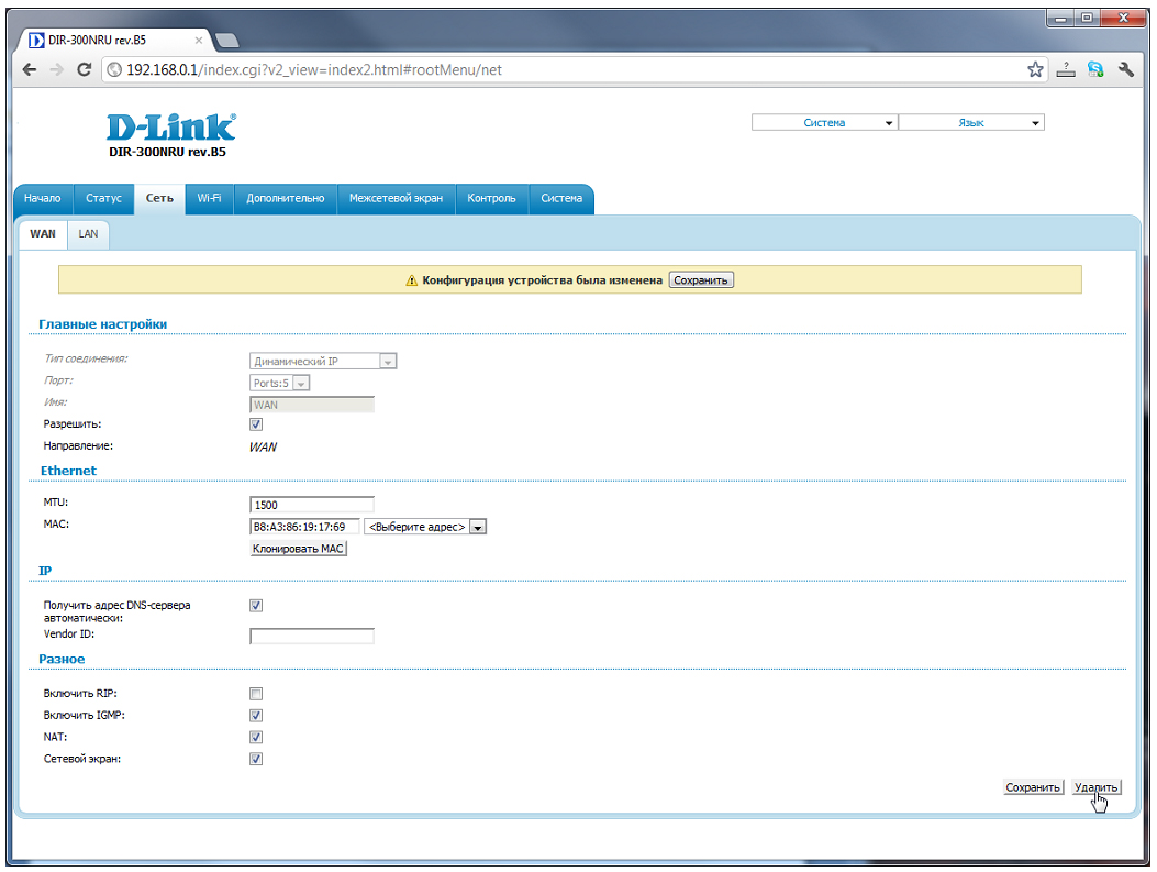 Попадаем в окно настройки «WAN», в самом низу есть 2 кнопки («Сохранить», «Удалить»), нажимаем кнопку «Удалить».