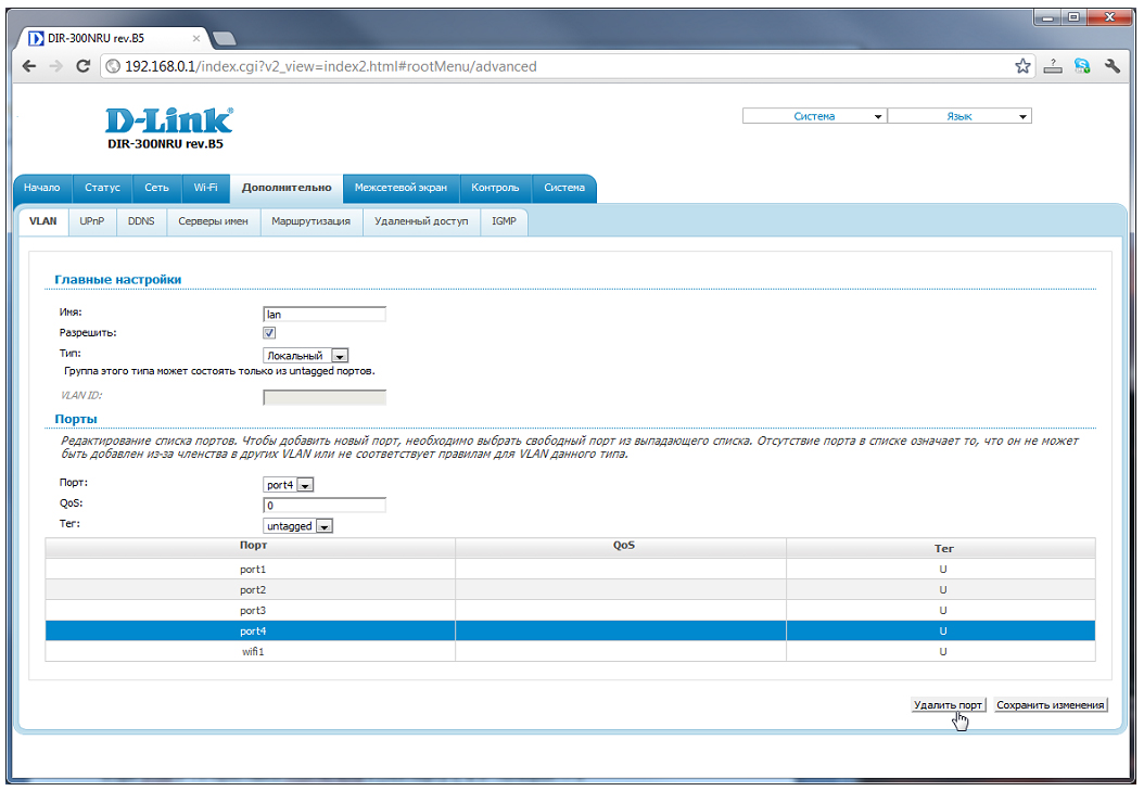 Выбираем один из портов lan (в нашем случае port4) и нажимаем кнопку «Удалить порт».