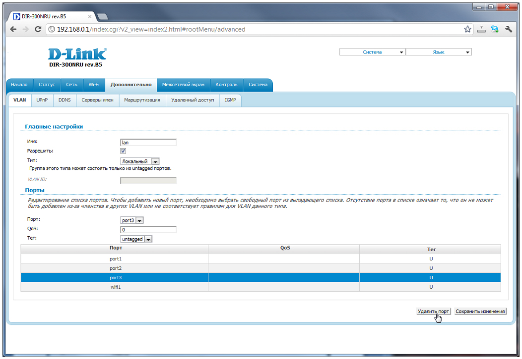 Выбираем еще один порт lan (в нашем случае port3) и нажимаем кнопку «Удалить порт».