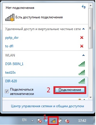 2. В открывшемся окне в списке доступных беспроводных сетей выделите беспроводную сеть маршрутизатора, щелкнув по ней левой кнопкой мыши, и нажмите кнопку Подключение (2).