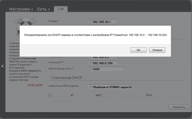 6. После нажатия кнопки Применить будет предложено отредактировать пул DHCP-сервера. Нажмите ОК.