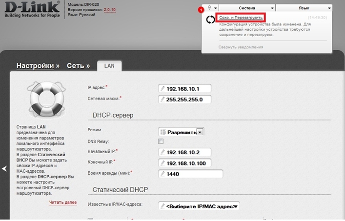 После перезагрузки необходимо обращаться к Wеб-интерфейсу по новому адресу (в данном примере 192.168.10.1). Убедитесь, что на сетевой карте компьютера установлены верные параметры.