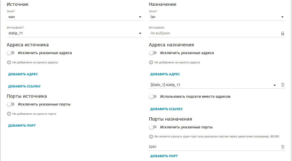 В разделе Назначение выберите зону lan, добавьте ссылку на соединение (в данном примере это statip_11) и укажите порт 5201.