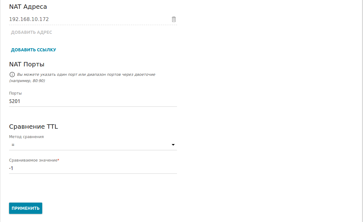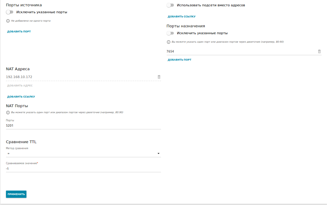 2.1. Выполните шаги 1.1, 1.2 и 1.3 из пункта 1. Но в поле Порт назначения в качестве внешнего порта укажите параметр, отличный от значения по умолчанию, например: 7654. А в качестве внутреннего порта – параметр NAT Порты со значением 5201. Нажмите кнопку Применить.
