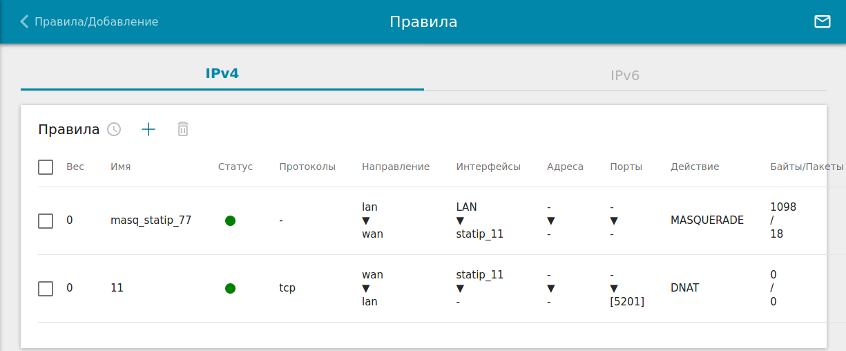 1.2 Во вкладке IPv4 добавьте новое правило, нажав на «+».