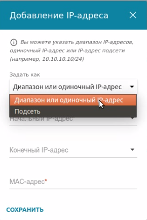 Примечание: в данном случае поле MAC-адрес заполнять не нужно. Это поле является обязательным только тогда, когда не заполнено поле Начальный IP-адрес/ IP-адрес подсети.