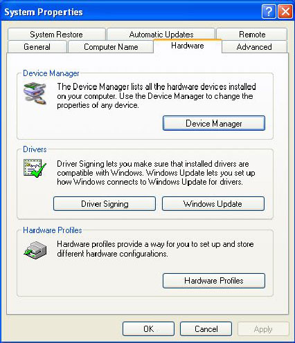 После установки ПО для DBT-120 убедитесь, что драйвер Microsoft Bluetooth установлен. Нажмите правой кнопкой "Мой Компьютер", выберите "Свойства", откройте закладку "Оборудование". Появится следующее окно: