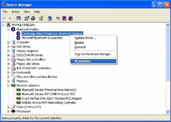 Bluetooth адаптера и выберите "Свойства"