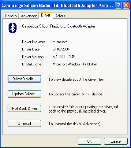 Появятся свойства Bluetooth адаптера. Выберите закладку "Драйвер", появится следующее окно: