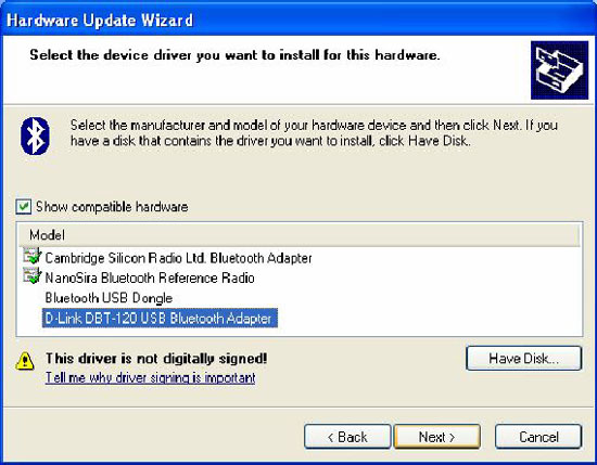 В следующем окне отобразятся доступные для установки драйвера. Выберите D-Link DBT-120 USB Bluetooth Adapter и нажмите "Далее" для завершения установки.