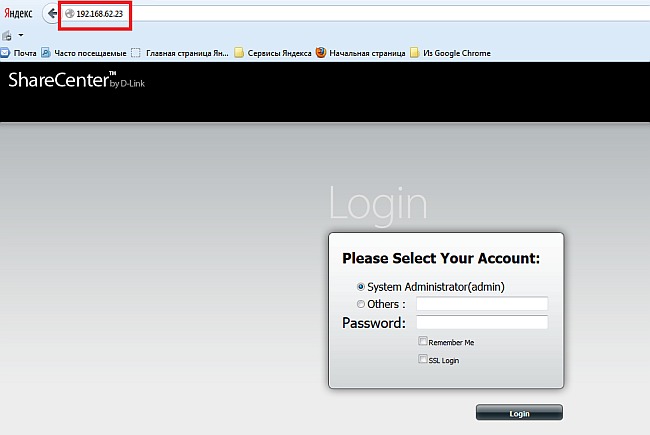 2. Зайдите в WEB-интерфейс накопителя. Для этого запустите браузер и в адресной строке введите текущий IP-адрес NAS. Откроется окно авторизации, вводим логин "admin" пароль, по умолчанию, оставляем пустым.