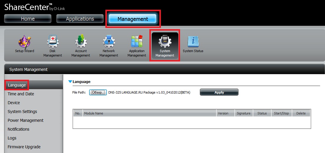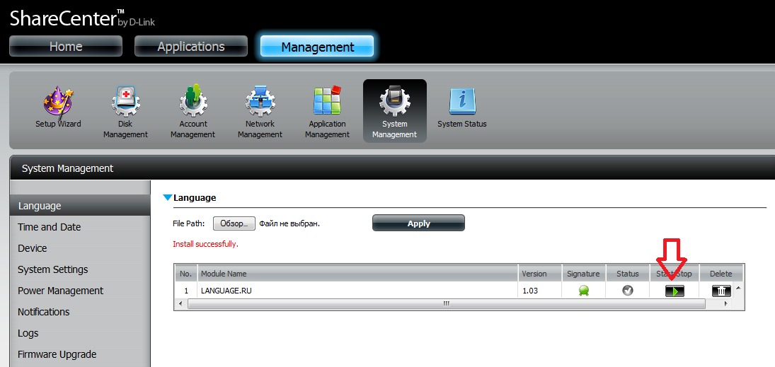 3. После авторизации установим русский язык. Для этого скачиваем русcификатор с сайта www.dlink.ru . Далее заходим в раздел Management - System Management - Language и выбираем скаченный нами файл. Нажимаем Apply