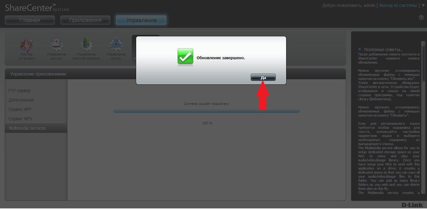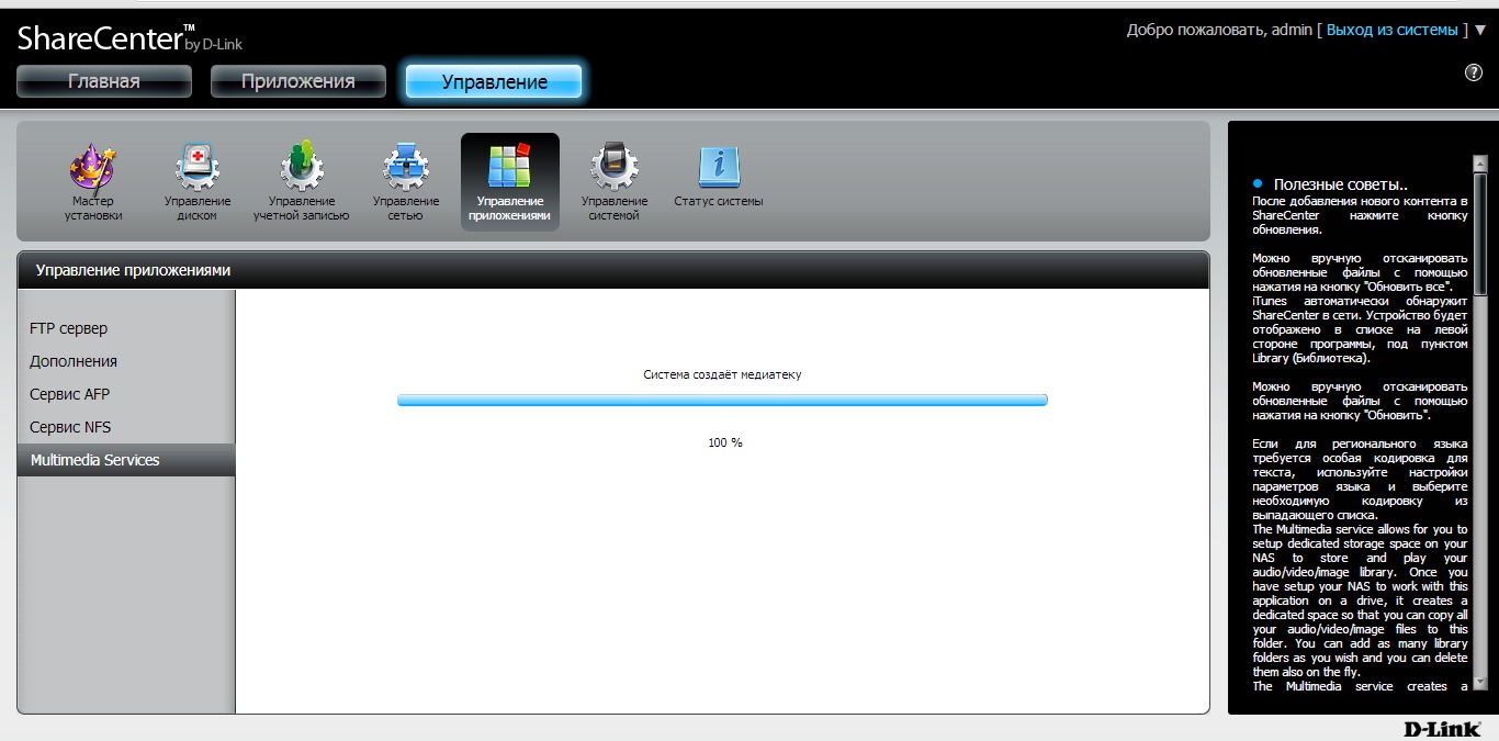 В процессе создания медиа библиотеки, будут доступны остальные функции накопителя. По окончании появится информационное окно, и добавленная папка будет отображаться в списке общих папок.