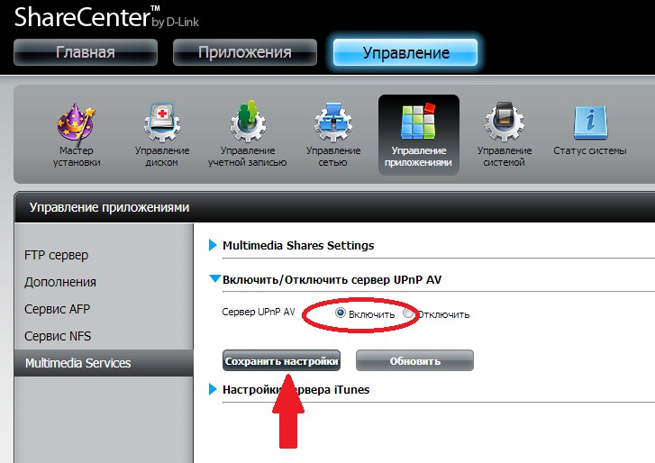 5. Убедитесь, что сервер UPnP AV включен. Если нет, то поставьте указатель в положение Включено и нажмите Сохранить настройки.
