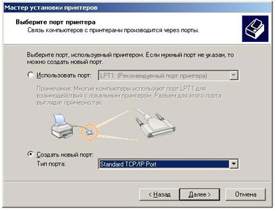 6. В появившемся окне выберите пункт Создать новый порт, тип порта Standard TCP/IP Port. Нажмите Далее