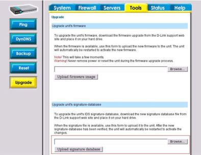 2. На странице Tools->Upgrade в разделе Upgrade unit's signature-database нажать на кнопку Browse и выбрать файл обновления на жестком диске ПК.