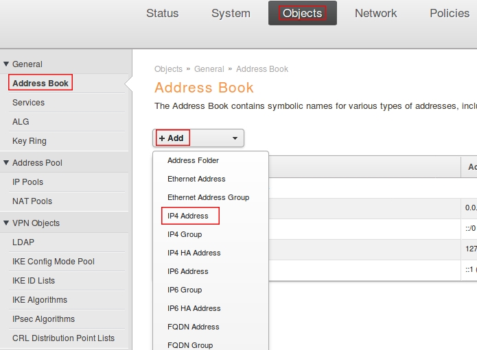 Пройдите в Web интерфейсе Object → Address book, нажмите кнопку Add и выберите IP4 Address.
