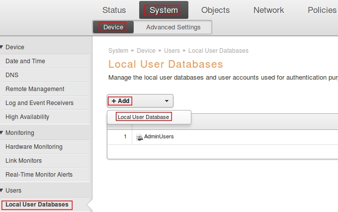 Пройдите в Web интерфейсе System → Device → Local User Databases, нажмите кнопку Add и выберите Local User Database.