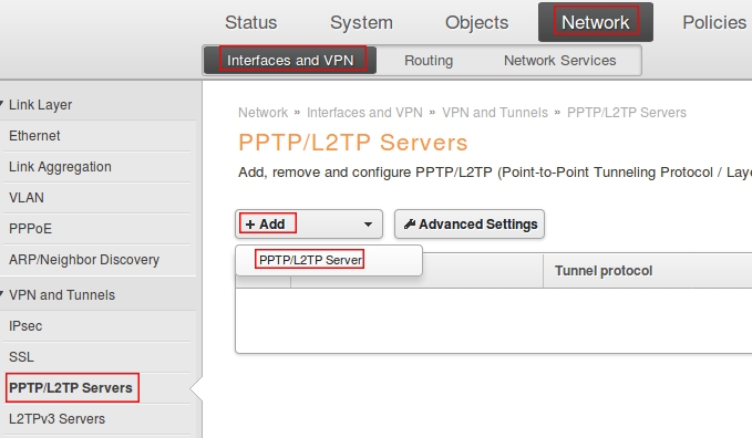 Пройдите в Web интерфейсе Network → Interfaces and VPN → PPTP/L2TP Servers, нажмите кнопку Add и выберите PPTP/L2TP Server.